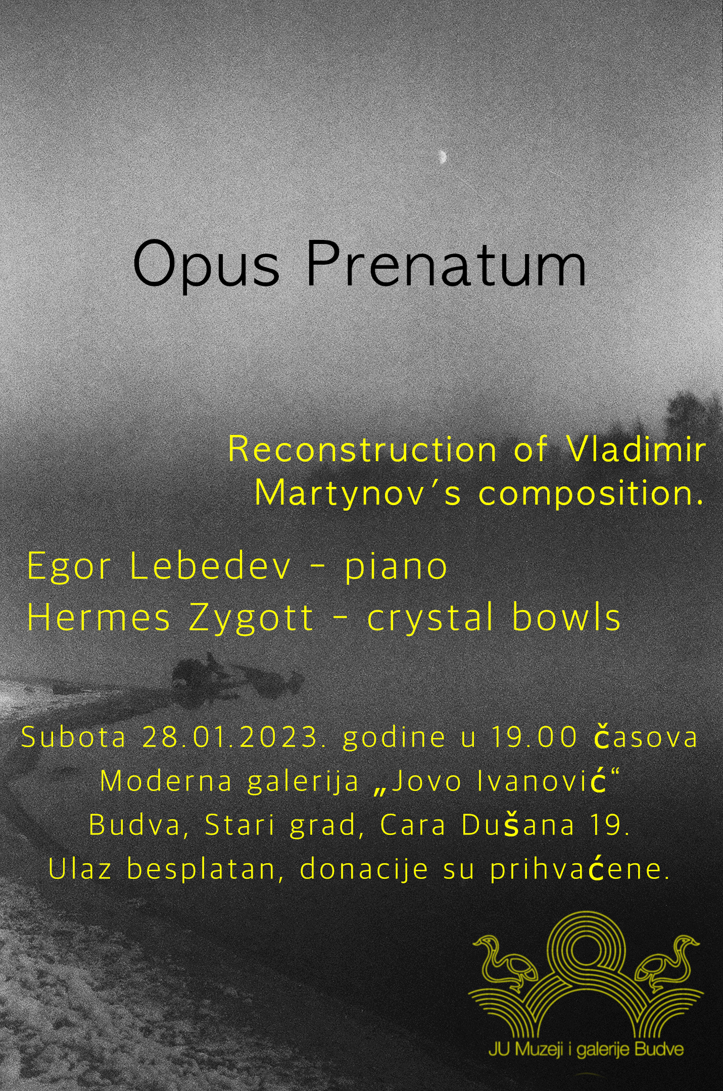 JU Muzeji i galerije Budve u subotu 28. 1. 2023. godine sa početkom u 19 časova u Modernoj galeriji „Jovo Ivanović” organizuje koncert pod nazivom „Opus Prenatum” – djelo kompozitora Vladimira Martinova. Rekonstrukciju djela ce izvjesti Egor Lebedev – klavir, Hermes Zigot (Hermes Zygott) – kristalne zdjele.