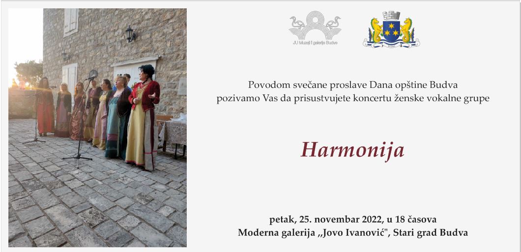 U organizaciji JU Muzeji i galerije Budve u petak, 25. novembra 2022. godine, u 18 časova u Modernoj galeriji „Jovo Ivanović”, povodom svečane proslave Dana opštine Budva će biti upriličen koncert ženske vokalne grupe „Harmonija”. Gosti koncerta će biti Ninoslava Zlatković, solo klavir i vokalni kvartet koji čine Iva Otašević, Lara Pavićević, Milica Radović i Nikola Karadžić.