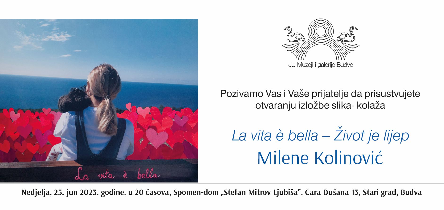 U organizaciji JU Muzeji i galerije Budve u nedjelju, 25. juna 2023. godine, u 20 časova u Spomen-domu „Stefan Mitrov Ljubiša” će biti otvorena izložba slika-kolaža La vita è bella – Život je lijep umjetnice Milene Kolinović. Izložbu će zvanično otvoriti Predrag Zenović, predsjednik Savjeta za kulturu Opštine Budva. Kustos izložbe je Vasilisa Gagović, istoričar umjetnosti.
