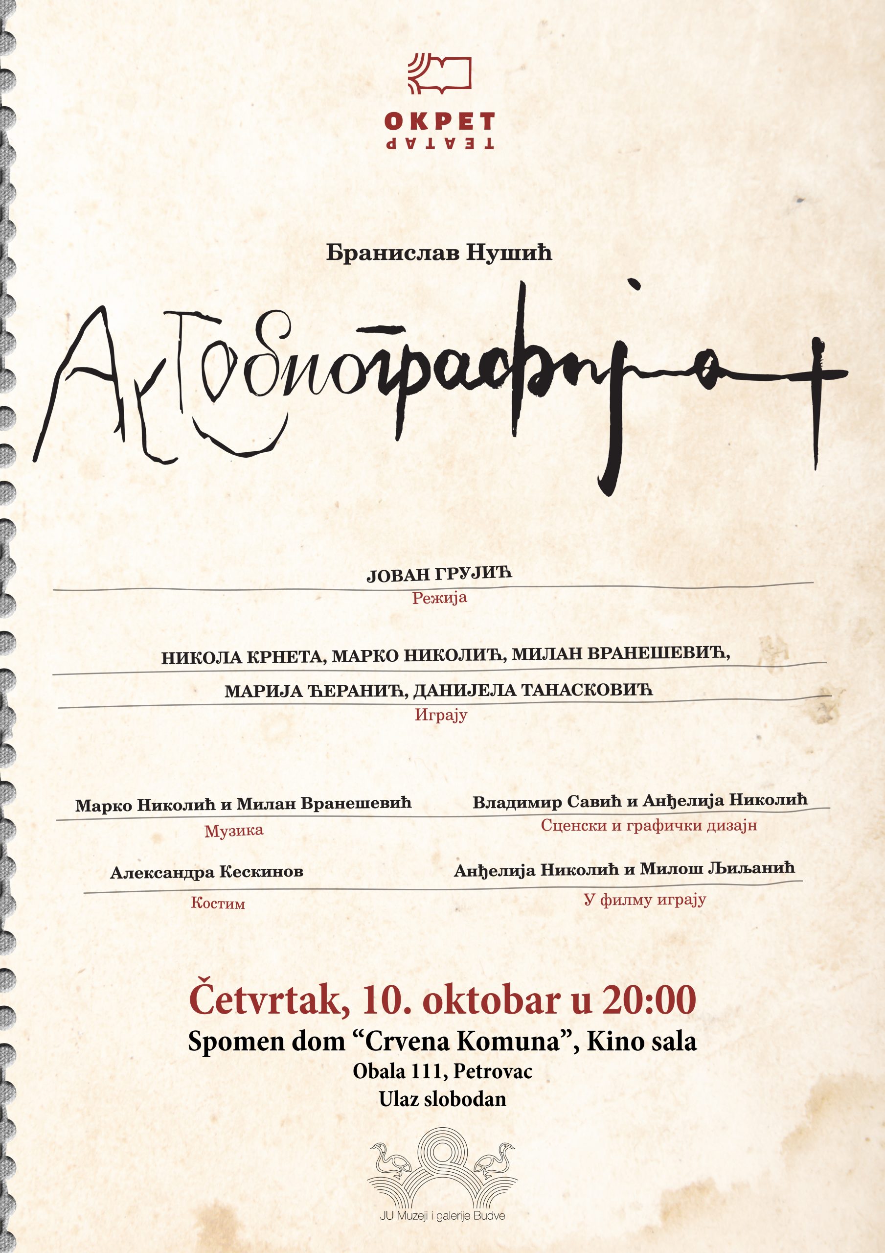 U organizaciji JU Muzeji i galerije Budve u kino sali Spomen-doma „Crvena komuna“ u Petrovcu, u četvrtak 10.oktobra sa početkom u 20 časova će biti odigrana pozorišna predstava Teatra Okret iz Beograda pod nazivom „Autobiografija“ rađena po djelu Branislava Nušića. Predstava je imala preko 200 igranja u regionu i uvijek privlači veliku pažnju publike. Predstavu je režirao Jovan Grujić, muziku su radili Marko Nikolić i Milan Vranešević, scenski i grafički dizajn Vladimir Savić i Anđelija Nikolić a kostime je radila Aleksandra Keskinov. U predstavi igraju U predstavi igraju: Nikola Krneta, Marko Nikolić, Milan Vranešević, Marija Ćeranić i Danijela