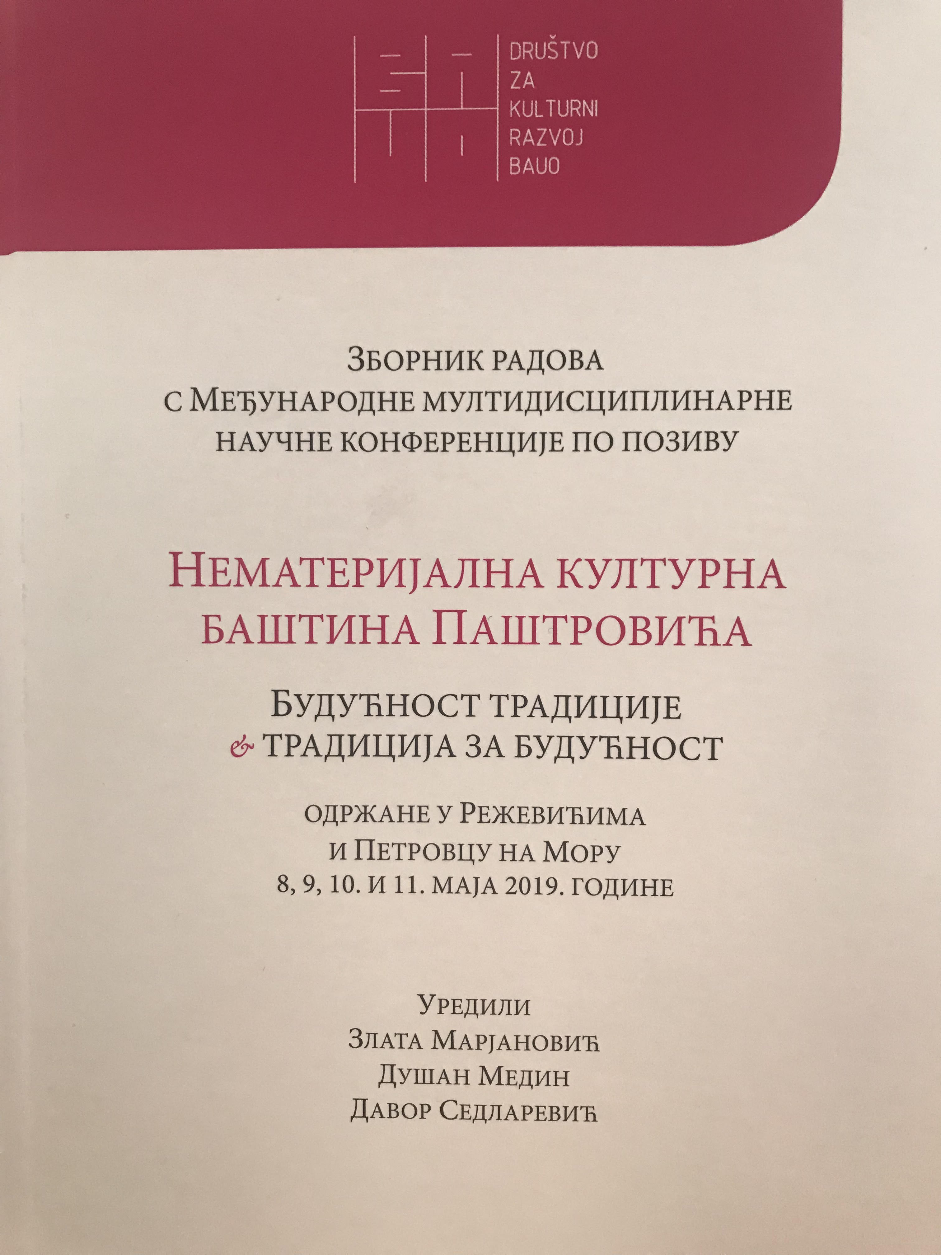 Objavljivanje ovog zbornika radova je podržalo Ministarstvo kulture Crne Gore. Zbornik se sastpji iz četiri ključna poglavlja pod nazivima: Budućnost tradicije, Tradicija za budućnost, Varia odnosno razno i Prilozi. Urednici zbornika su doc. dr Zlata Marjanović, mr Dušan Medin i Davor Sedlarević, dok rezencije potpisuju akademik Zlata Bojović (Beograd), akademik Radomir V. Ivanović (Beograd), prof. dr Aleksandar Čilikov, vanredni član CANU (Cetinje), prof. dr Marijana Kokanović Marković (Novi Sad), prof. dr LJiljana Gavrilović (Beograd), prof. dr Borjanka Trajković (Sombor), prof. dr Lidija Vujačić (Nikšić), doc. dr Zlata Marjanović (Banja Luka), dr Miroslav Luketić (Budva), dr Mila Medigović Stefanović (Beograd), dr Branko Banović (Podgorica), dr Katarina Mitrović (Beograd) i prof. Bojan Suđić, maestro (Beograd). Zbornik je predstavljen publici u tri crnogorska grada tokom jeseni 2019. godine, i to 4. novembra u petrovačkom Spomen-domu „Crvena komuna“, 5. novembra u JU Centar za kulturu Kolašin i 6. novembra u JU Muzeji i galerije Nikšić.
